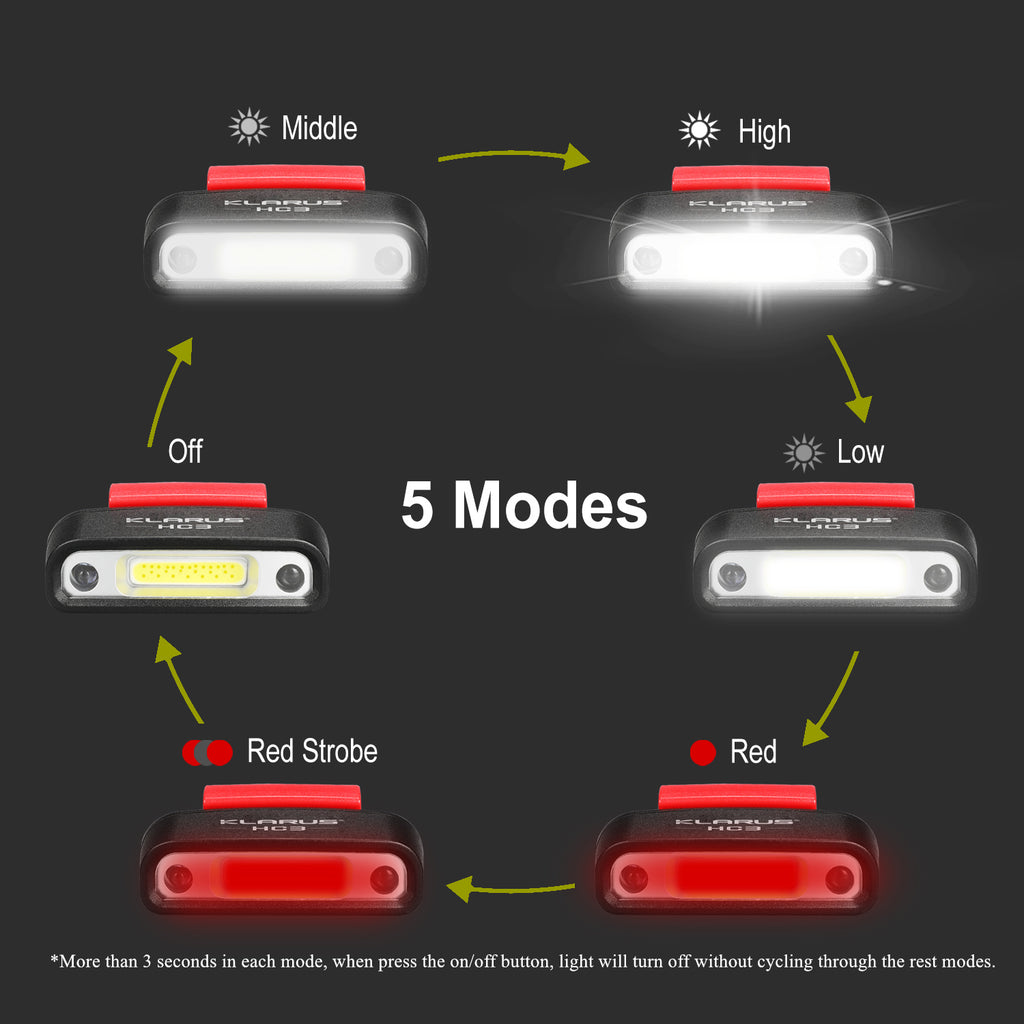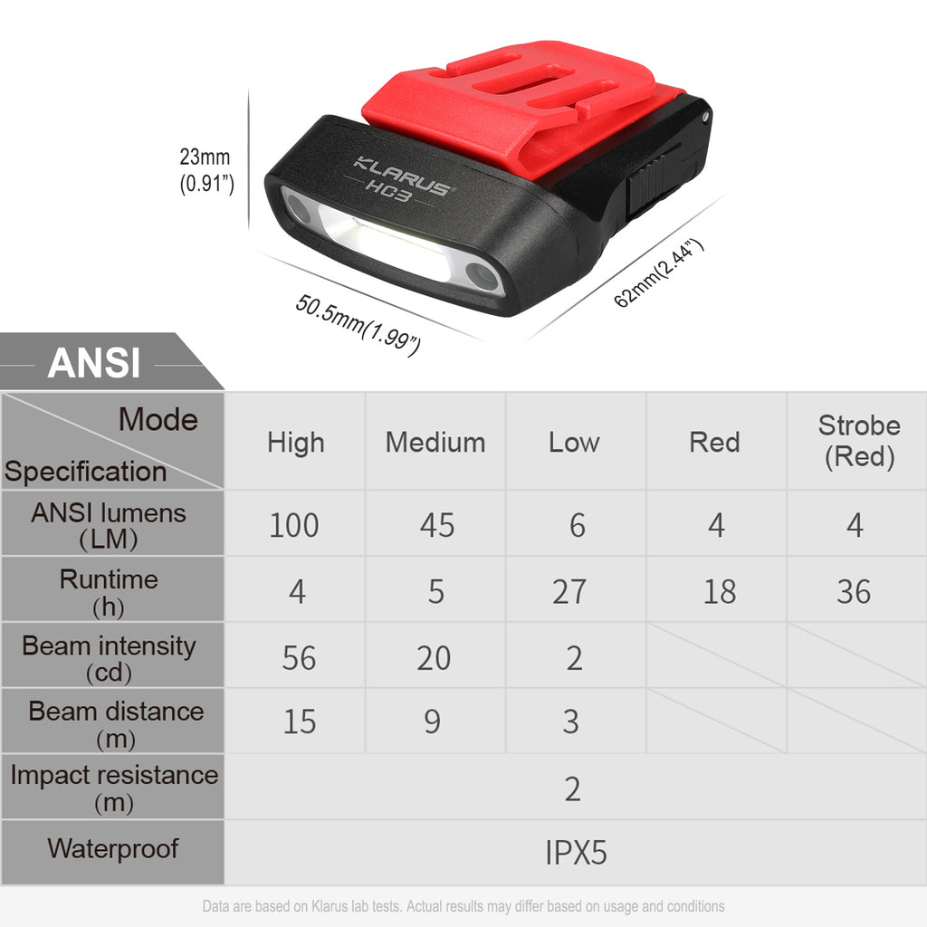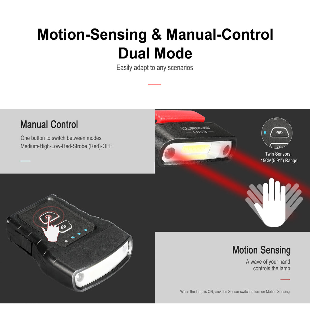 The Klarus HC3 will quickly become your preferred lighting method with its dual mode interface for precise control. Take control with either manual mode or the motion sensor mode. The manual mode consists of a single button interface that will cycle between medium, high, low, high red output, and red strobe modes. Or press the motion-sensor button and quickly turn on the Klarus HC3 with a wave of your hand.