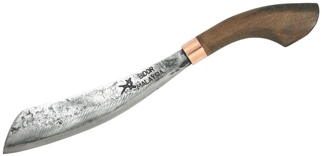The Duku Chandong, sometimes referred to as the "Ray Mears", the parang originates from East Malaysia. It's a general purpose tool, and what sets it apart from other parangs is the sheepsfoot's blade tip and how the handle is elevated. The tip is very strong and suitable for prying, and the upward handle causes the blade to arrive first followed by the knuckles. This feature works great especially if you are cutting near the ground or near a solid object such as a big tree trunk, because it prevents you from bashing your knuckles. The 5160 carbon steel blade has a slightly upward curve, which favors slicing and chopping methods. This type of cut is very effective at cutting small plants as well as thicker wood or vegetations.